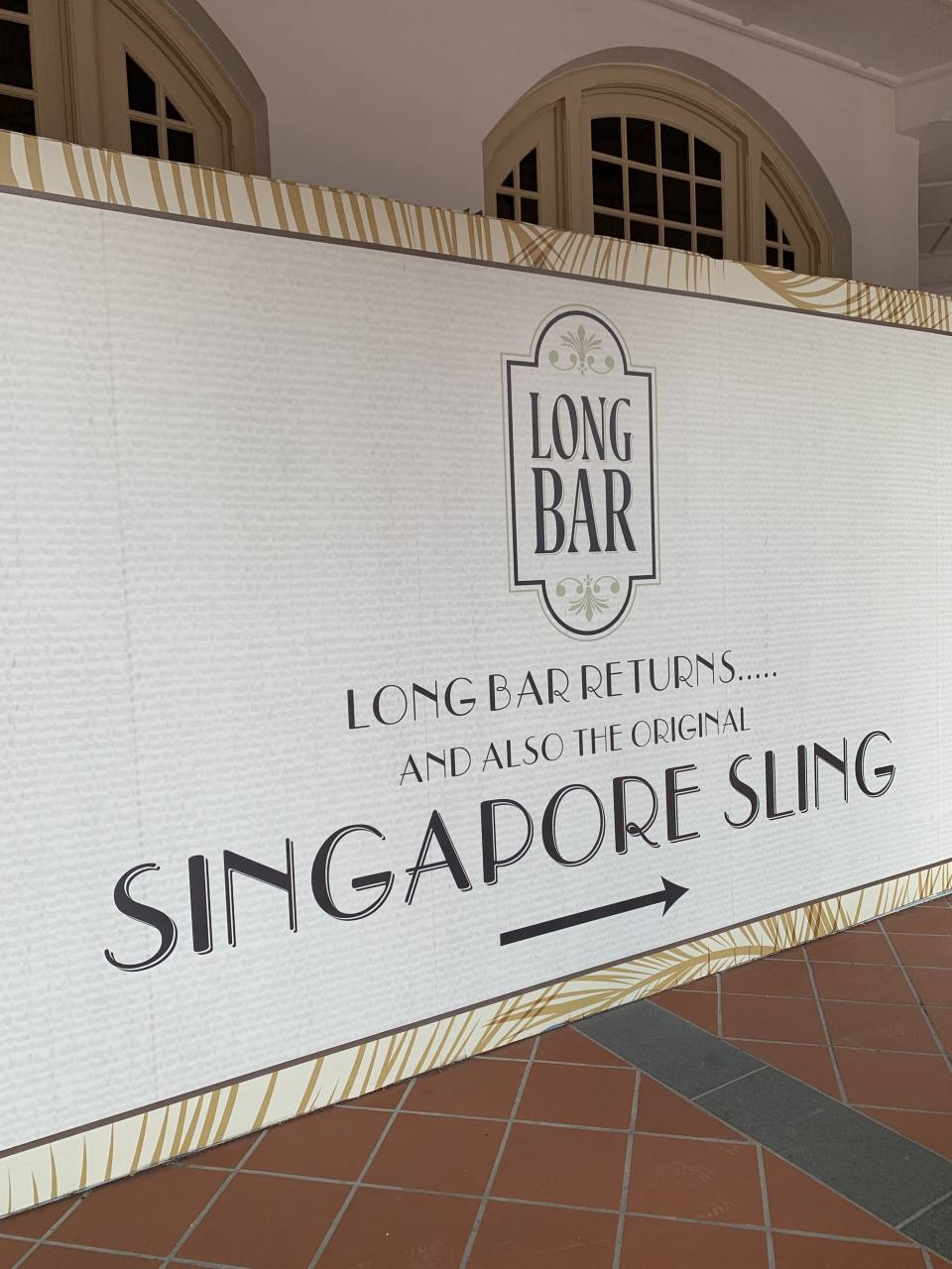 Ensimmäisellä Singapore -käynnillämme kuulimme, että Raffles -hotelli, jonka baarissa kyseinen drinksu on yli sata vuotta sitten kehitelty, on paraikaa remontissa ja kiinni, joten cocktailit jäivät meiltä väliin. Toisella visiitillä sitten selvisi, että hotellin baari on jälleen avattu ja Singapore Slingejä pääsee taas maistelemaan, ja tottakai näin sitten myös tehtiin. Pakko sanoa, että oli se hyvää, ja ehkäpä tosiaan eri makuista kuin muualla (vertailun vuoksi testasin yhden myös hotellissamme, hih). Rafflesin Long Bar, jossa cocktaileja tarjoillaan, on kauniisti sisustettu siirtomaa-ajan henkeen, ja juoman kylkiäisenä saa pussillisen maapähkinöitä.